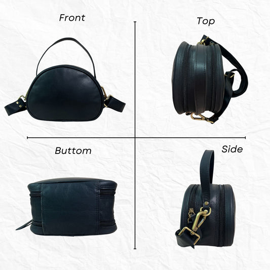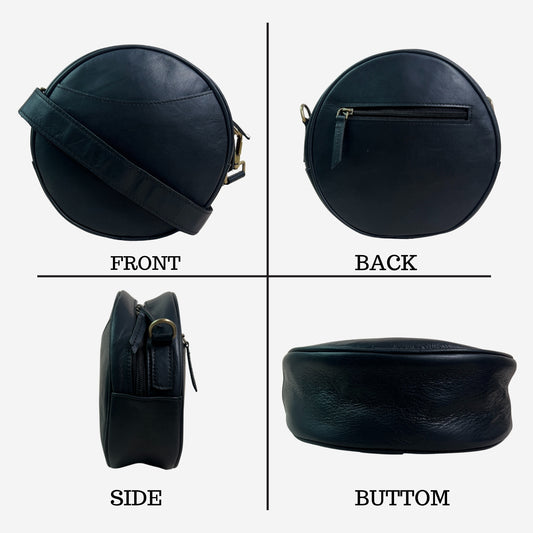 Madosh Stylish Round Crossbody Bag for Women – Small Circular Genuine Leather Purse with Adjustable Strap Black Side Shoulder Fashion Handbag