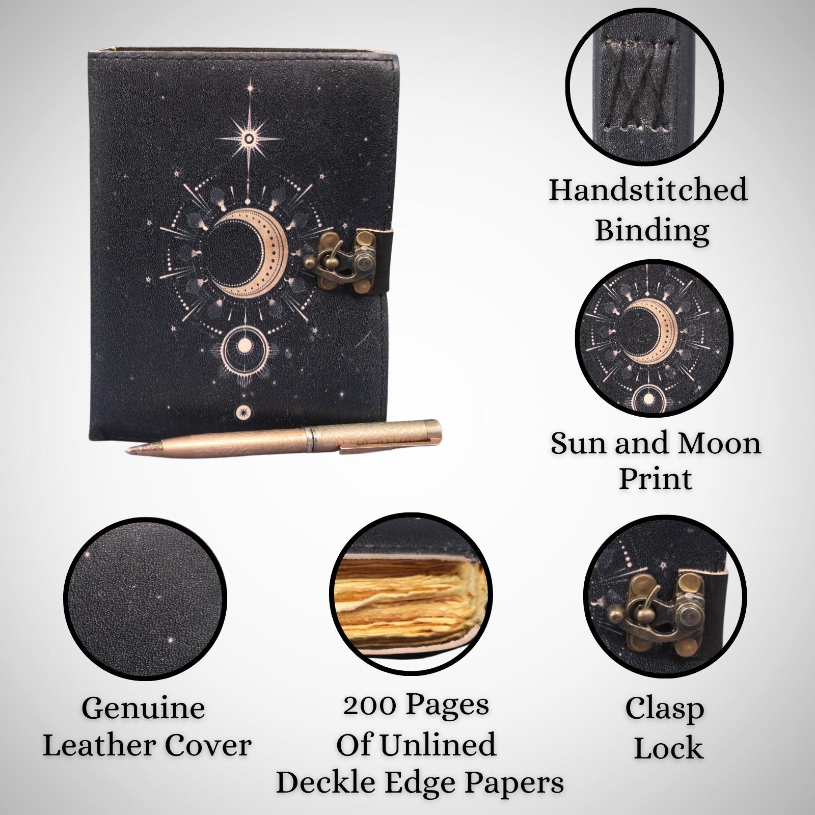 Celestial UV Print Genuine Leather Bound Grimoire Journal Black Cover Diary Book
