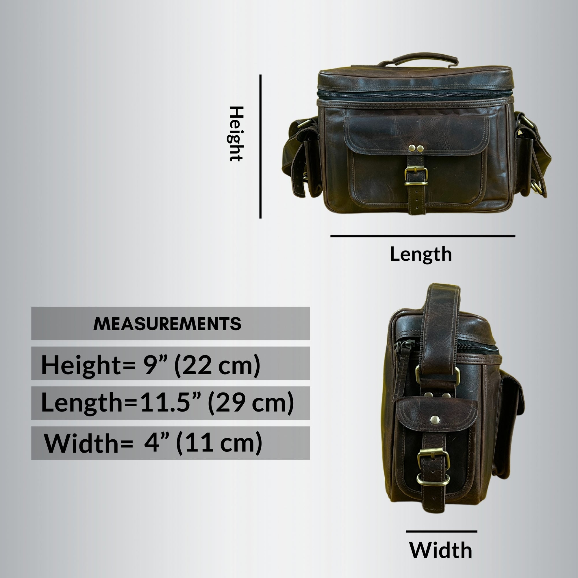 Holds a DSLR or mirrorless camera, 2-3 lenses, and other accessories. Front Pocket with Buckle Closure, Keep small items like batteries, memory cards, and stuff easily accessible. Side Pockets, Perfect for storing extra accessories or personal items while on the go. Designed for photographers on the move, the adjustable padded shoulder strap offers maximum comfort, even during long hours of carrying. . Measurements- Height=9” (22 cm), Length=11.5” (29 cm), Width=4” (11 cm). This bag is reliable companion that makes every day effortlessly stylish.