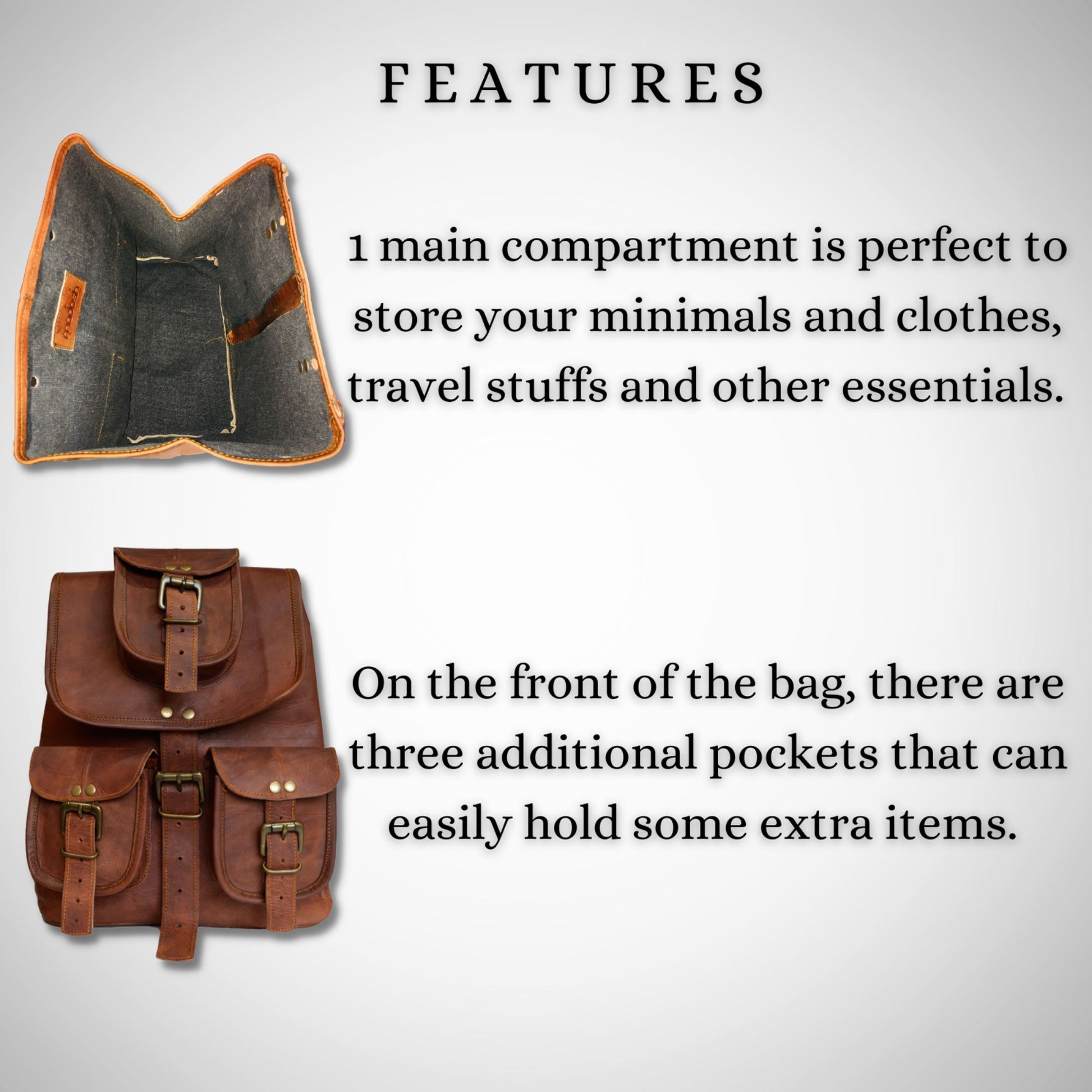 FEATURES: Telescopic back straps, 3 front pockets and buckle detailing, a drawstring cord and buckled leather flap for secure closure